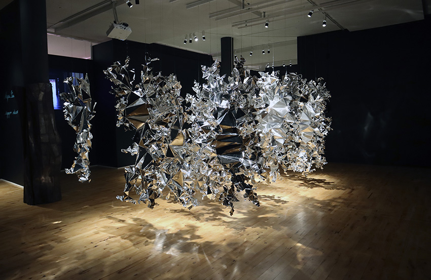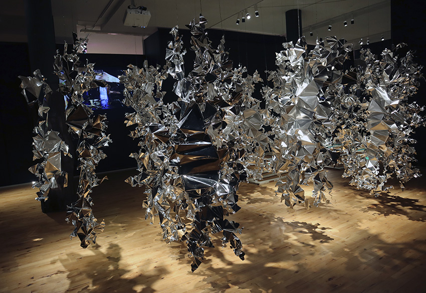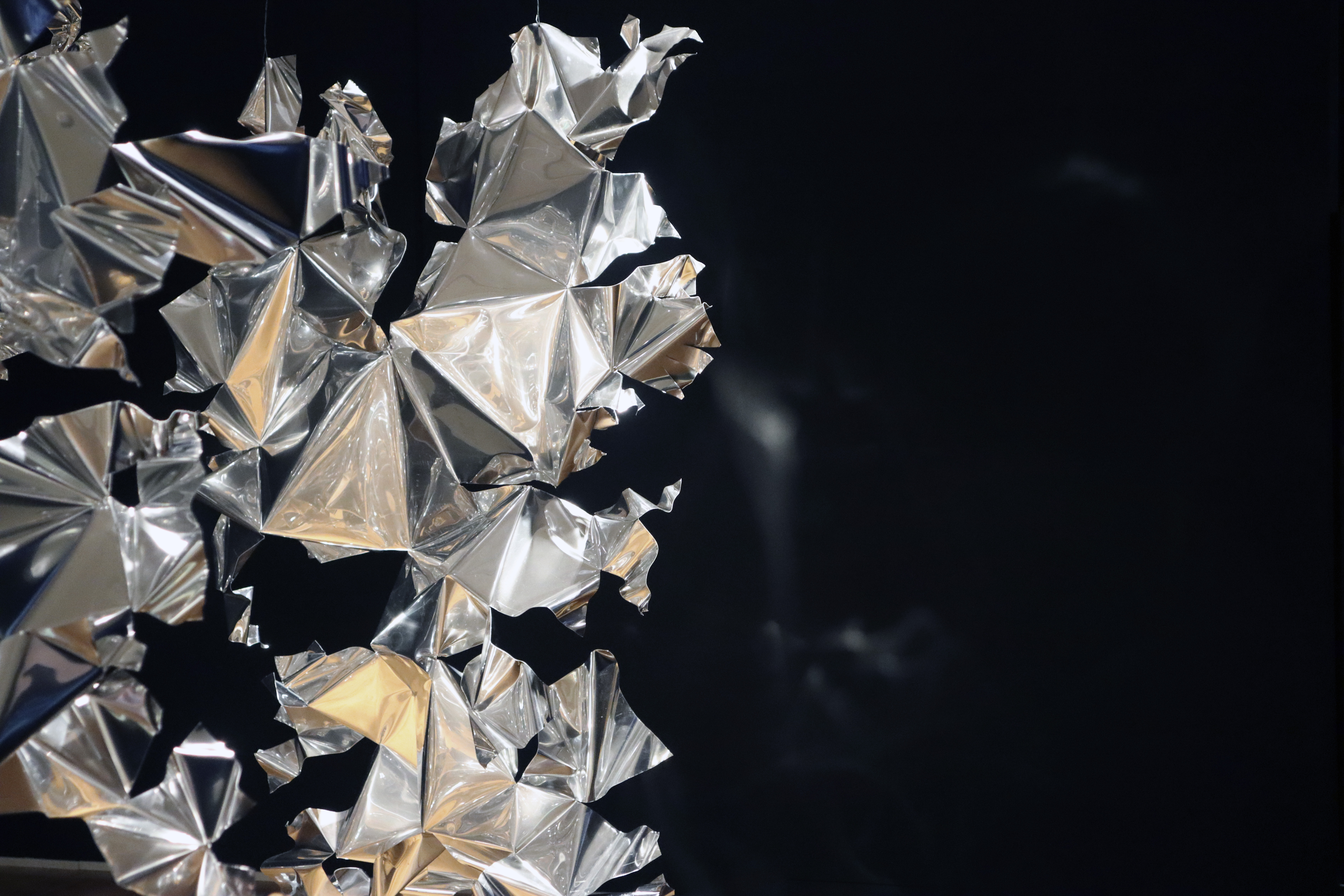 Med udgangspunkt i denne myte udfolder udstillingen en sanselig totalinstallation, der kredser om temaer som opløsning, gentagelse, spejling og ensomhed – i en dans mellem mennesker og natur. Som publikum bevæger man sig ind i et rum, hvor skulptur, performance og lyd flettes sammen. Fra loftet hænger en spejlskov af tyndt spejlpoleret aluminium, bukket i utallige facetter. Konstruktionen danner et psykedelisk rum i rummet – et visuelt ekko, hvor kroppen og omgivelserne spejles og fragmenteres. Spejlingen får et auditivt modstykke i et lydværk, af Felia Gram-Hanssen, baseret på ekkoet som fænomen. Gulvet aktiveres af en labyrint af dekonstruerede døre, der åbner for kig ned i flader af farvet voks. I skulptursamlingen står enkelte metalskulpturer, der binder an til installationerne i særudstillingsrummet.
